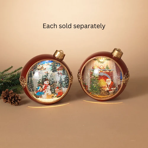 Christmas abounds in these 7.75-in diameter gold filigree wrapped matte red ornaments. Battery Operated lighted, musical spinning water globe. Gently swirling glittered water around a lighted detailed holiday scene centering around Santa placing presents by the Christmas tree and a lighted detailed holiday scene centering around children making a snowman.Â