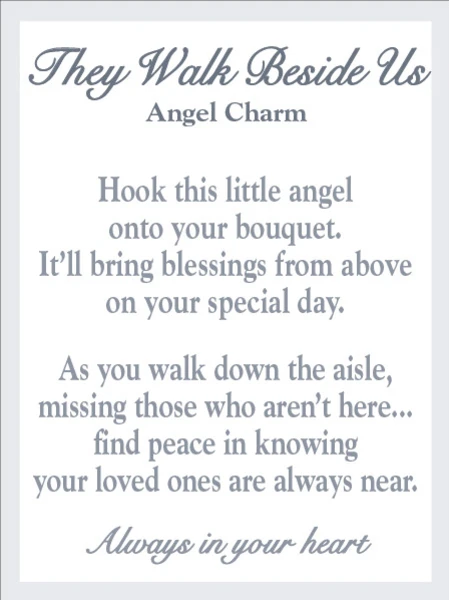 Hook this little angel onto your bouquet. It’ll bring blessings from above on your special day. As you walk down the aisle, missing those who aren’t there… find peace in knowing your loved ones are always near. Always in your heart.