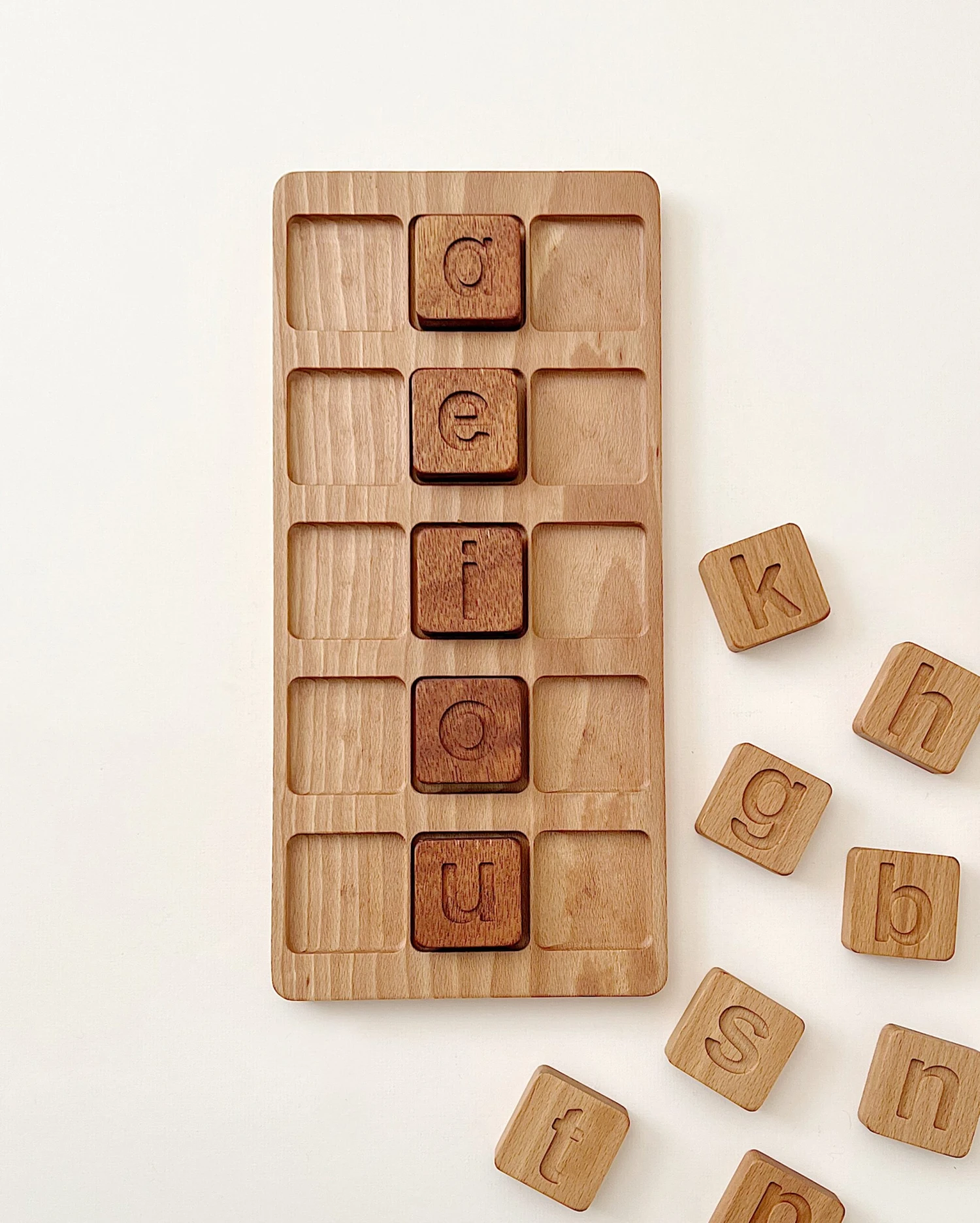 Material: Beech and walnut wood. The letters are coated with food grade mineral oil and the tray is unfinished.Â