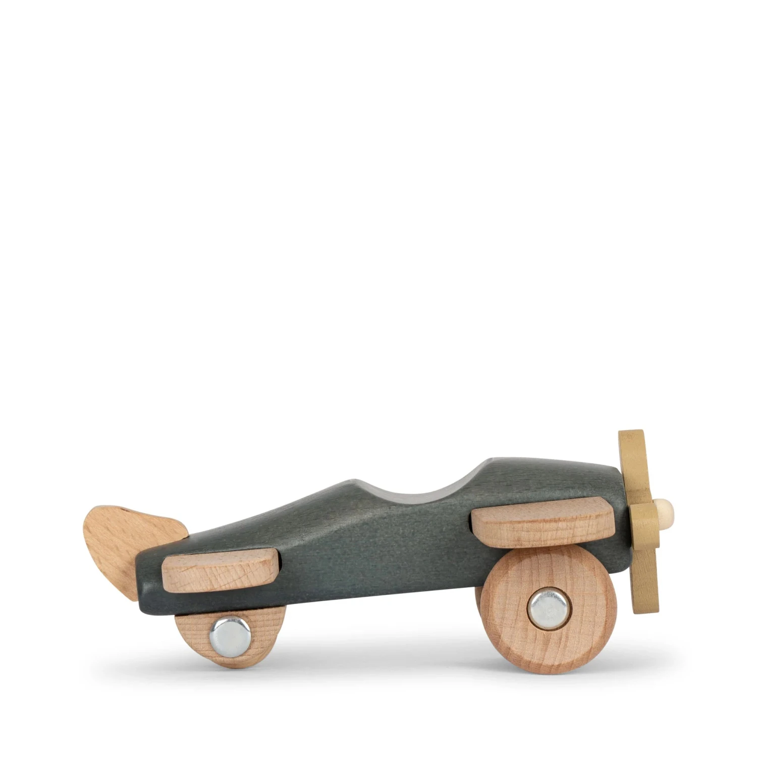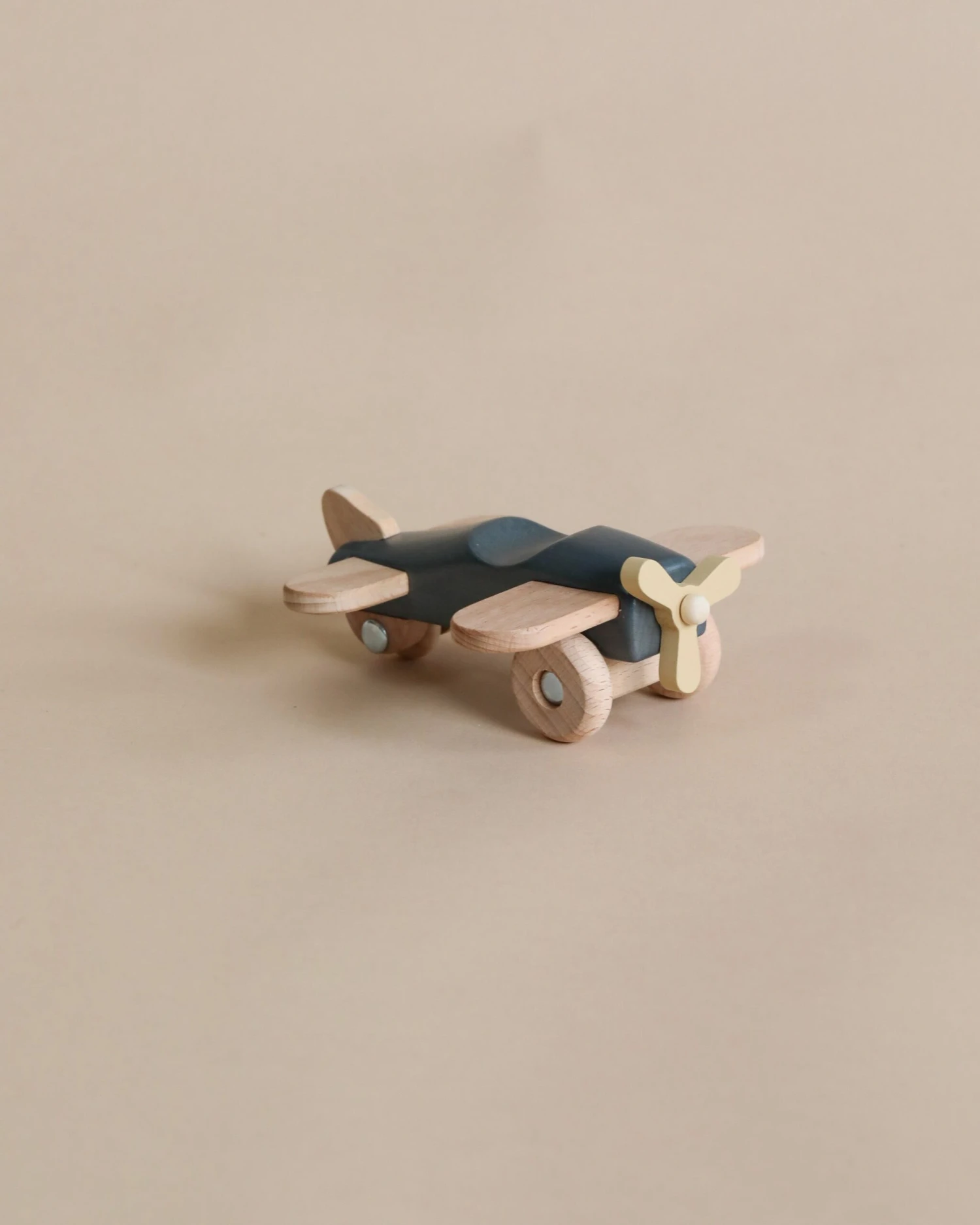 Airplane toy made with beechwood and nontoxic paint. Features movable wheels and propeller.