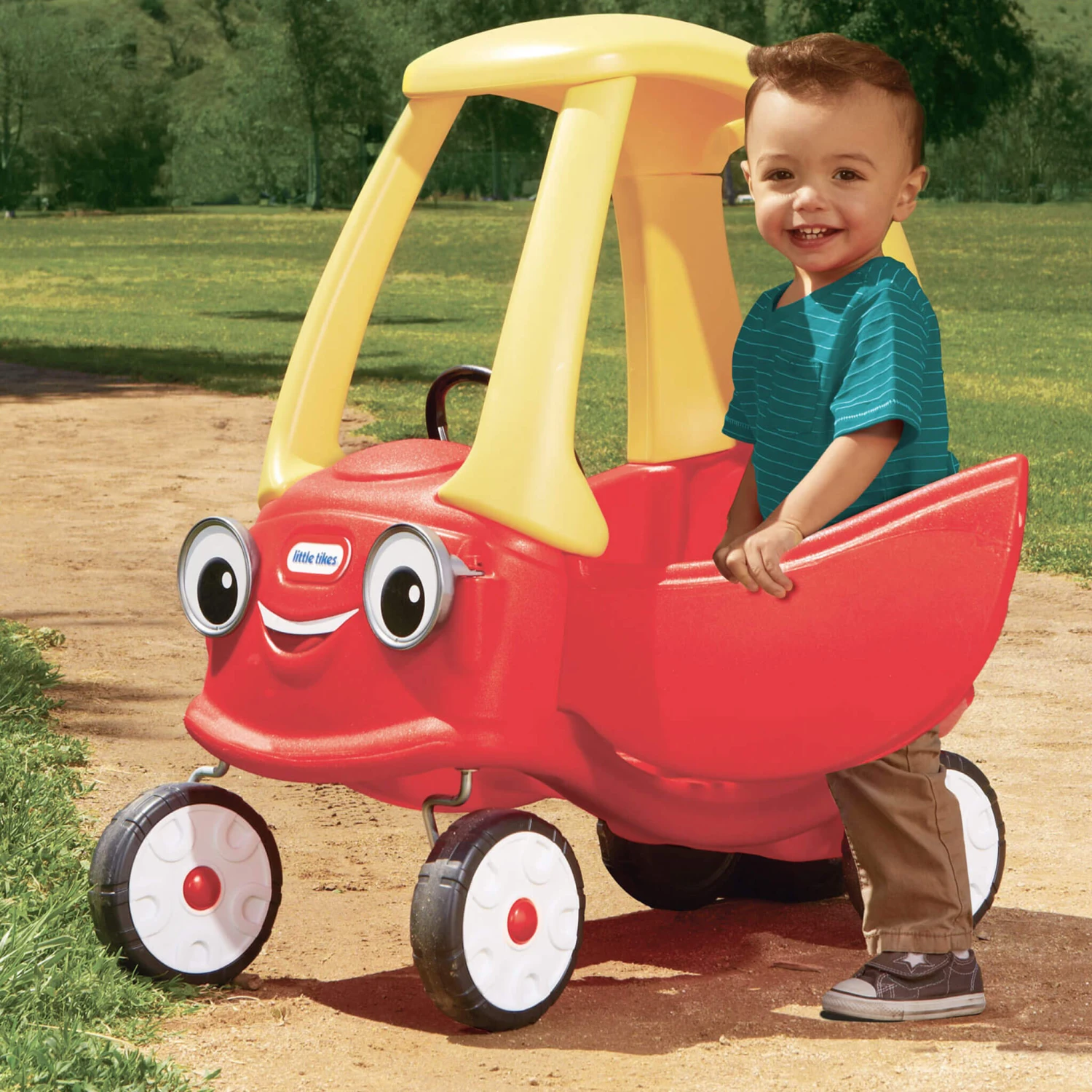 The Little Tikes Cozy Coupe ride on toy is an American classic. Featuring working doors, a horn, clicking ignition switch, gas cap, cup holders and spinning front wheels let them pretend like they’re driving around, this little coupe will make your little one super happy. The removable floorboard and built-in grip handle let them move on their own.