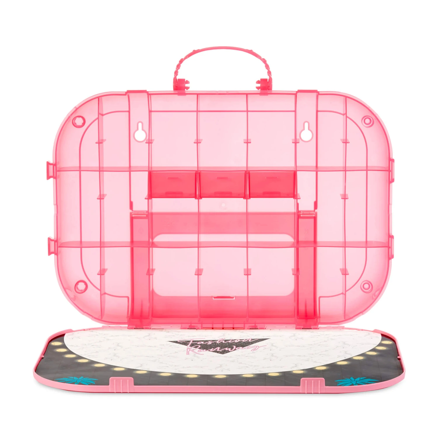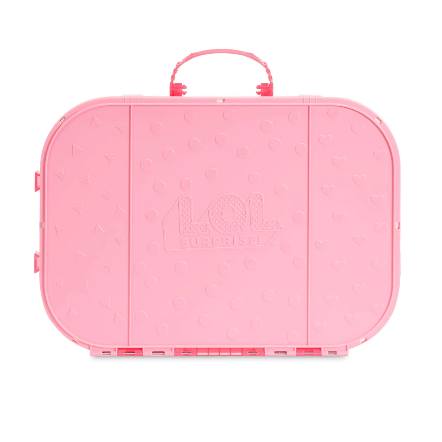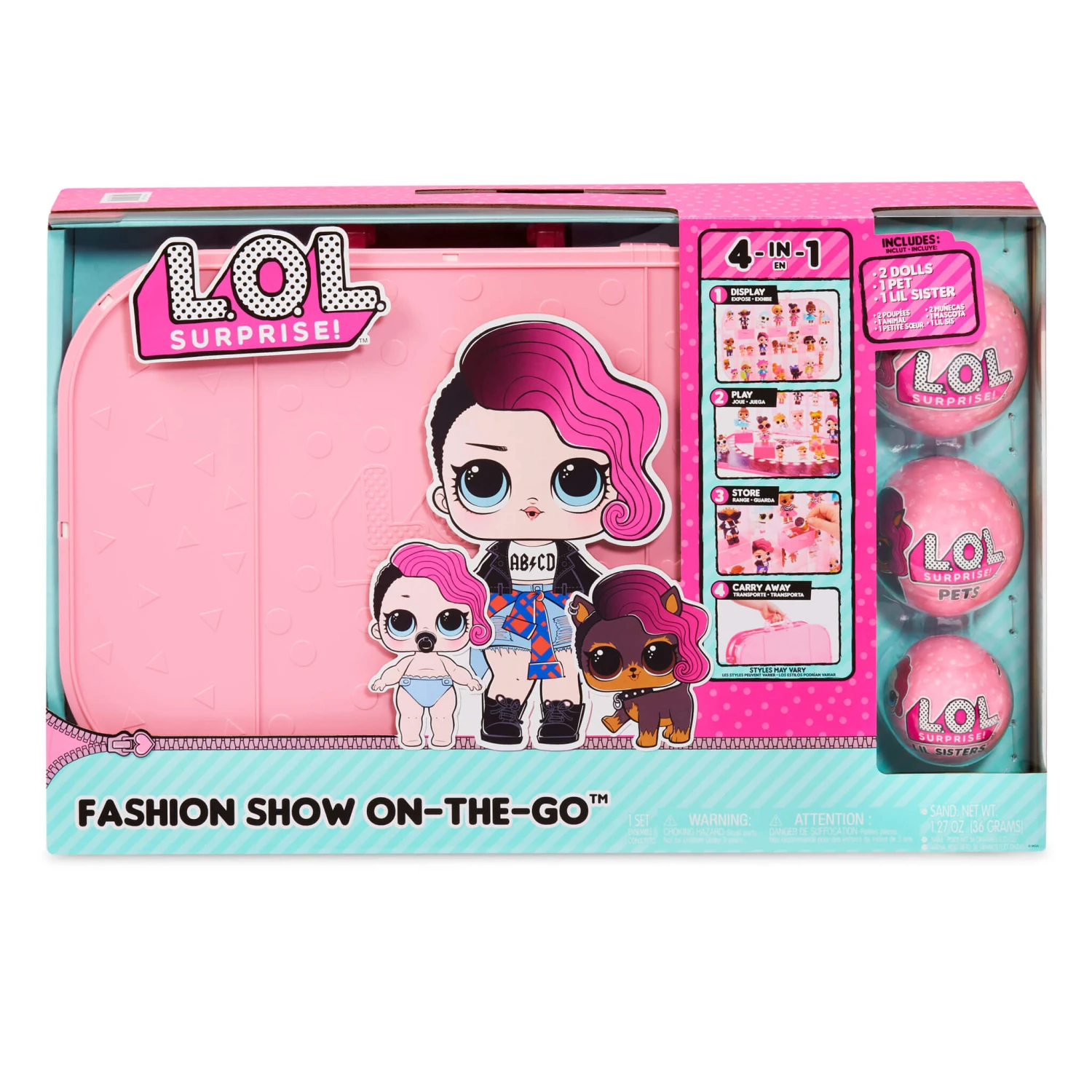 LOL Surprise Fashion Show On-the-Go is a 4-in-1 playset and carrying case. Play with LOL Surprise dolls on the fashion runway playset, display 18+ dolls and pets, store dolls and accessories, and carry away to take LOL Surprise on-the-go.