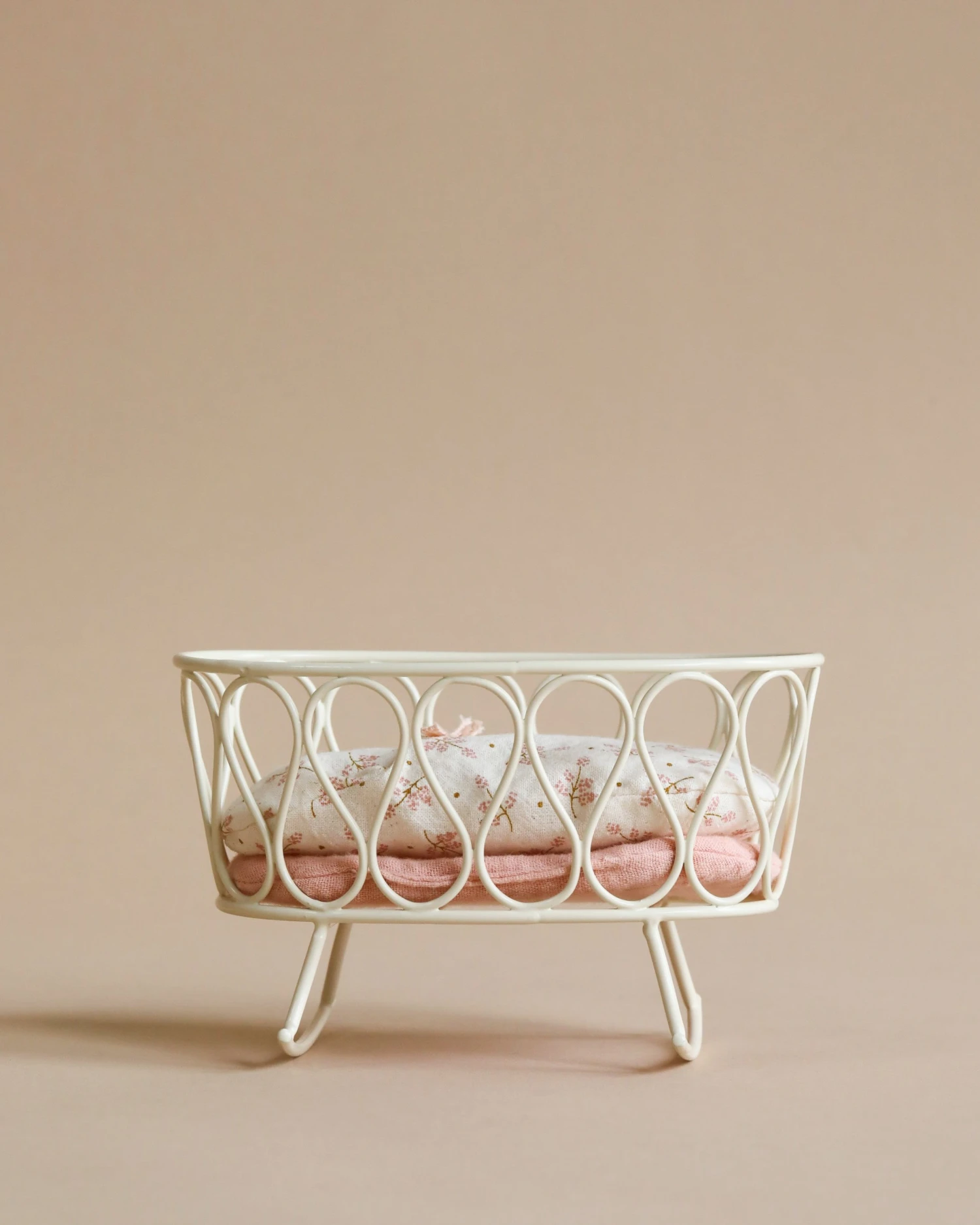 A beautifull designed cradle with a soft sleeping bag inside. The cradle is made of metal and you can easily rock your tiny soft toy into sleep.