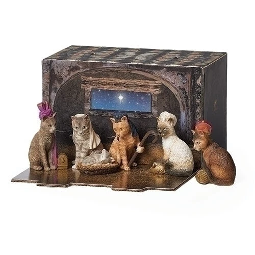This whimsical portrayal of the Holy Family uses cats as Joseph, Mary, Baby Jesus and the three wisemen. Everyone will smile at it and start a great conversation! A great gift for cat lovers! Printed on the box is “Purfect Pageant”.
