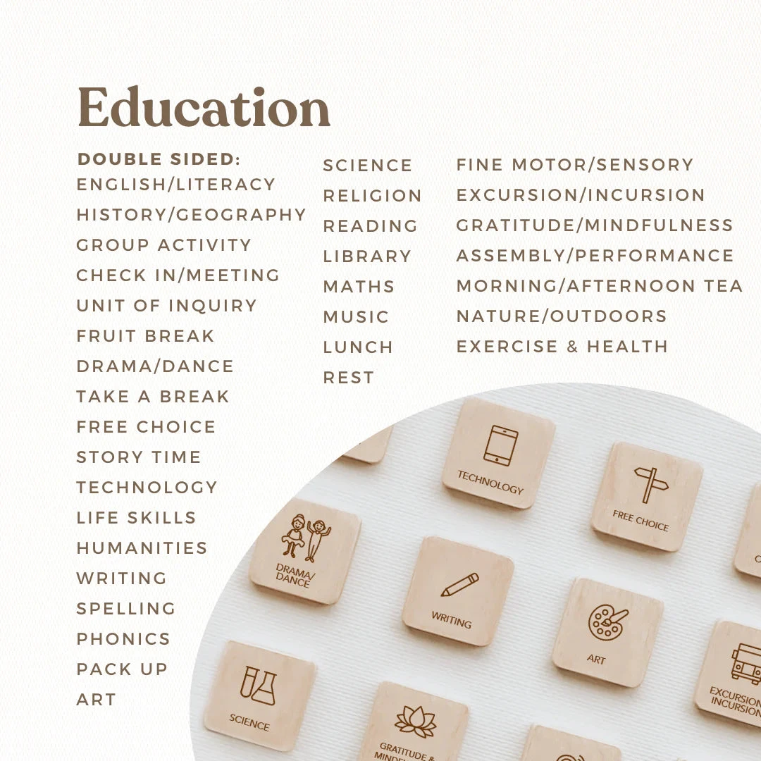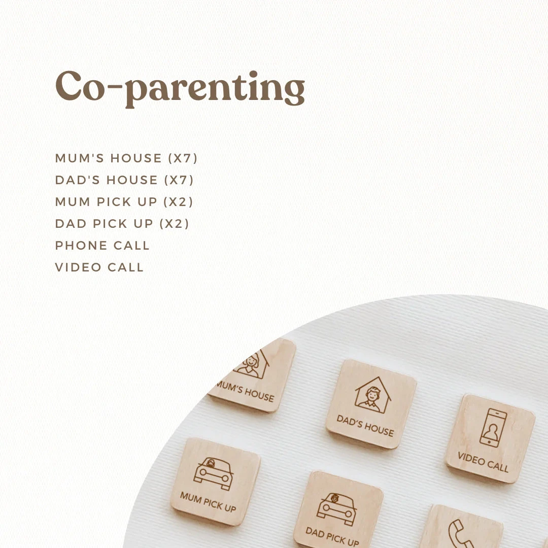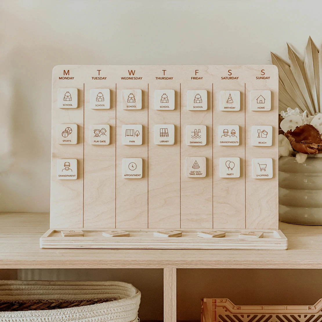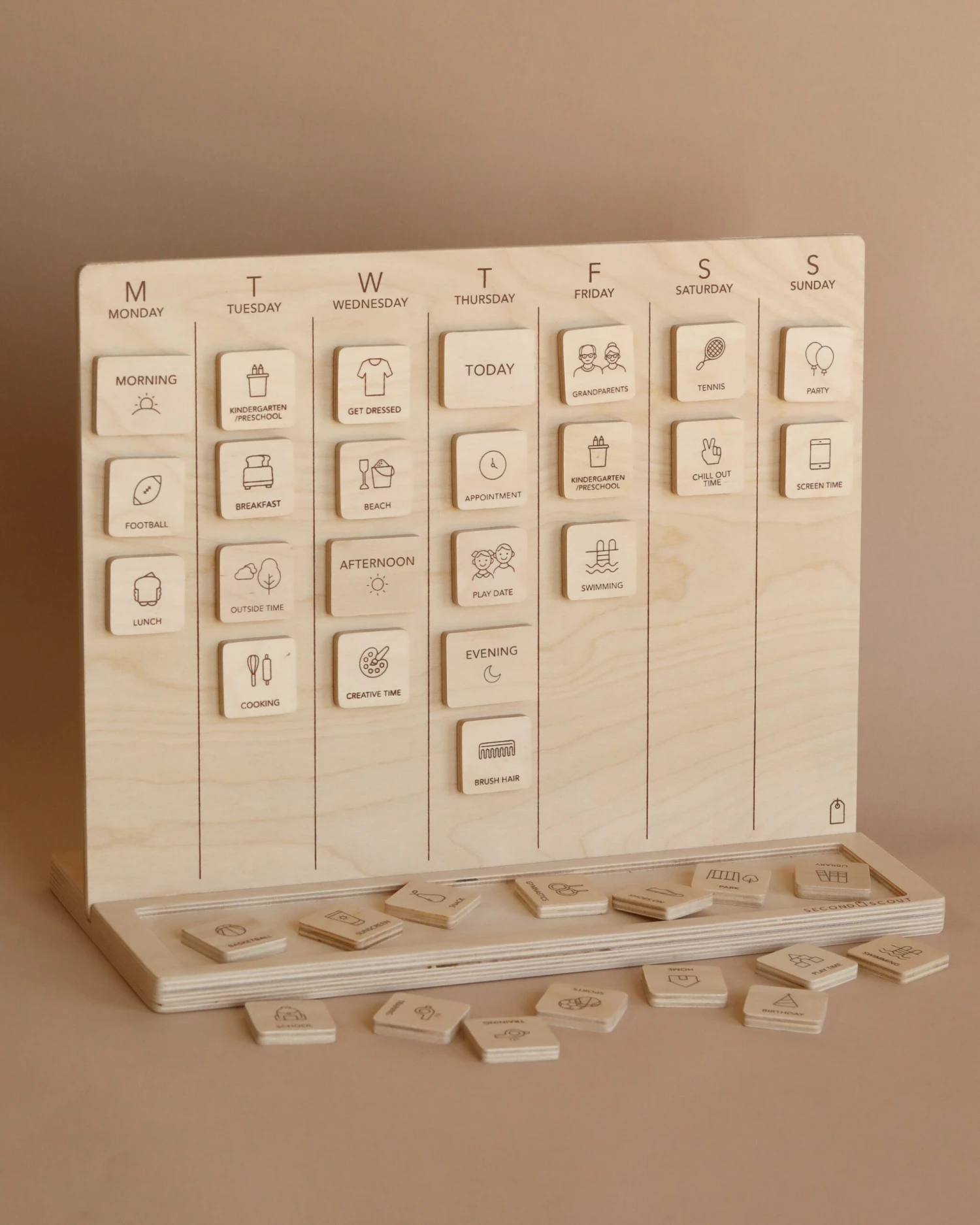 Starter set includes: 1 wooden backing board, 1 wooden base, 4 wooden shift tiles (today, morning, afternoon & evening) and the following tiles: School (side A), Kindergarten/Preschool (side B), Grandparents (side A), Grandparent (side B), swimming, play date, shopping, home, sports, party, birthday, appointment, library, park, eat out/ takeaway & beach.
