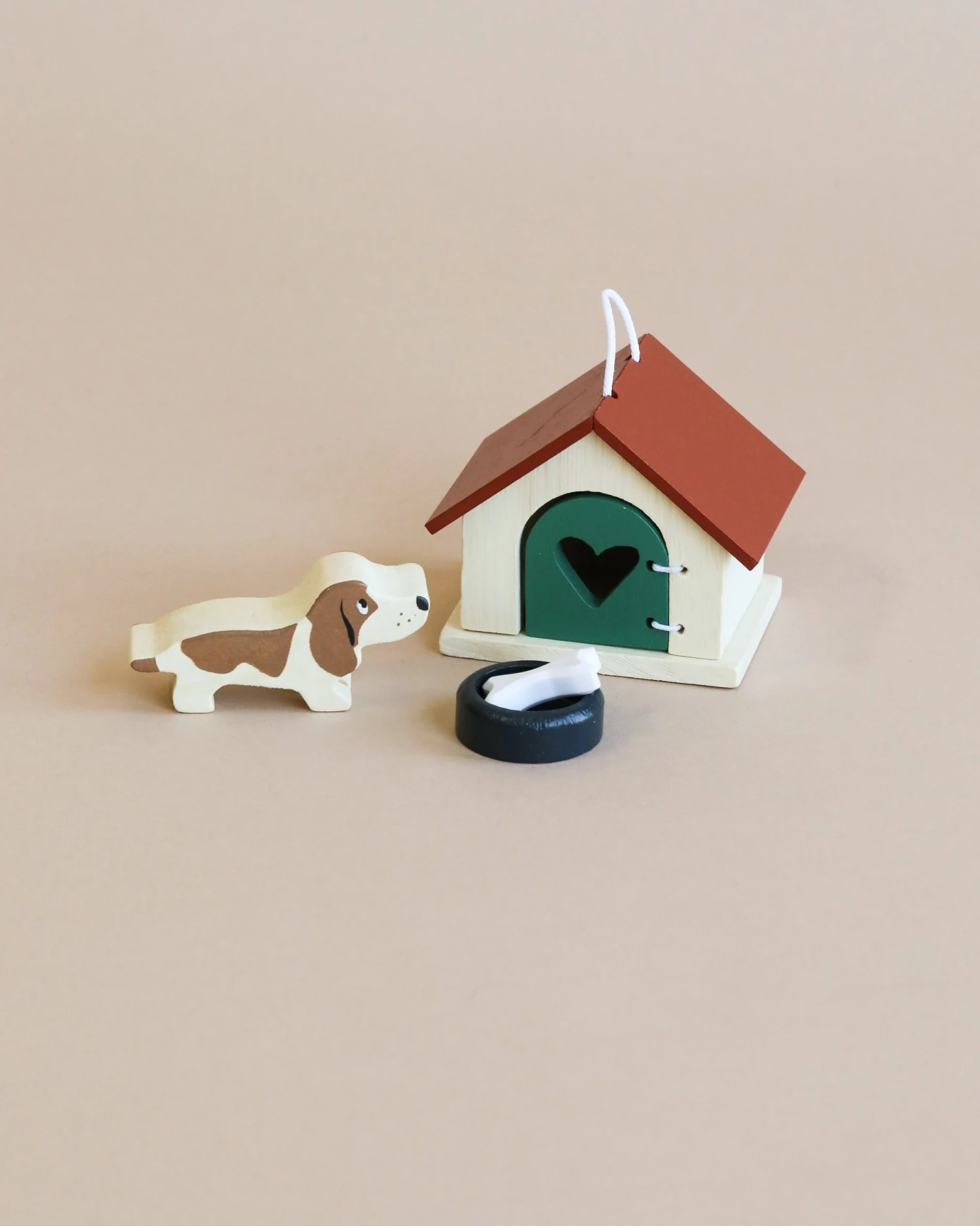 A charming basset hound dog with a bowl and a bone. Pretty kennel with opening door and carry handle. Suitable for all the wooden dolls houses, as scaled to 1:12.