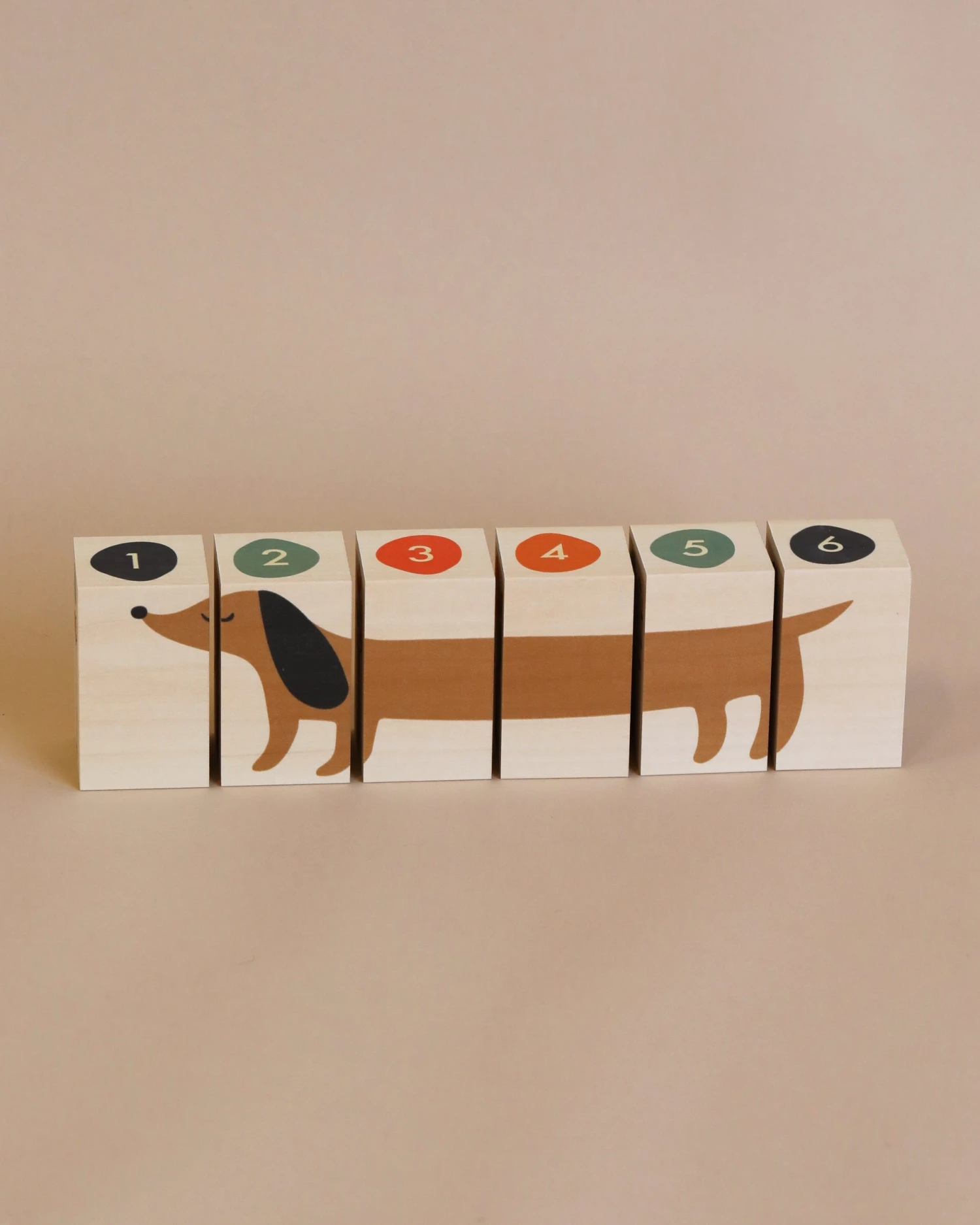 Explore the neighborhood environment. Count six houses. See how the weather changes with rains, clouds, sun, and moon. Put the dog puzzle together and measure eighteen inches with a ruler. This artful set is fun for play, and a pleasure to display.