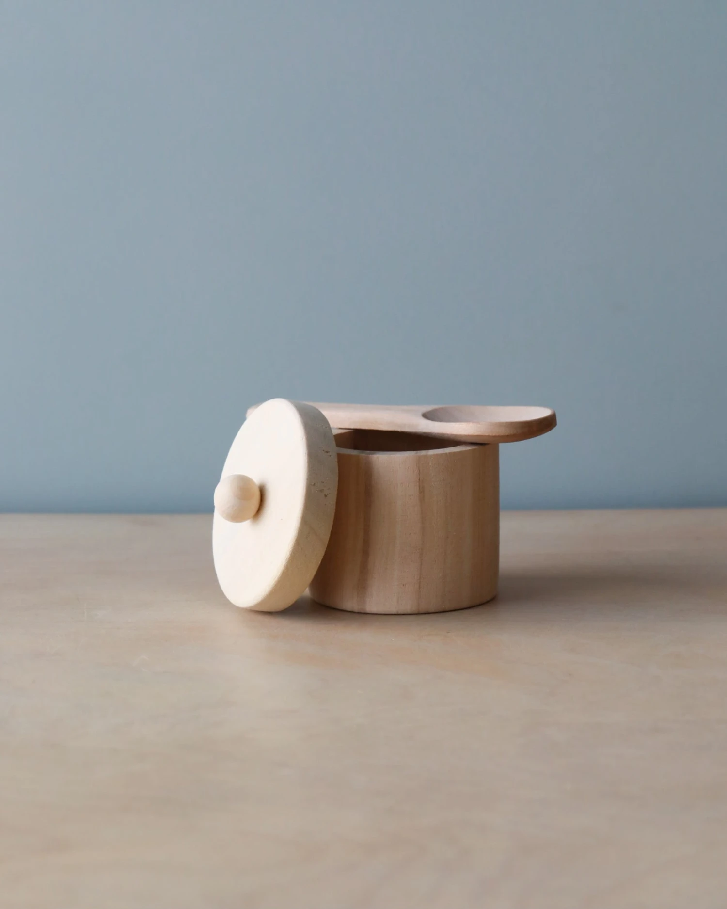 The loveliest little jar and spoon set crafted from 100% Pinewood, the Feeding Set is smooth to the touch and made with little hands in mind. With an easily removable lid, and soft rounded spoon, this feeding set will provide hours of imaginary play for the little chef.Â