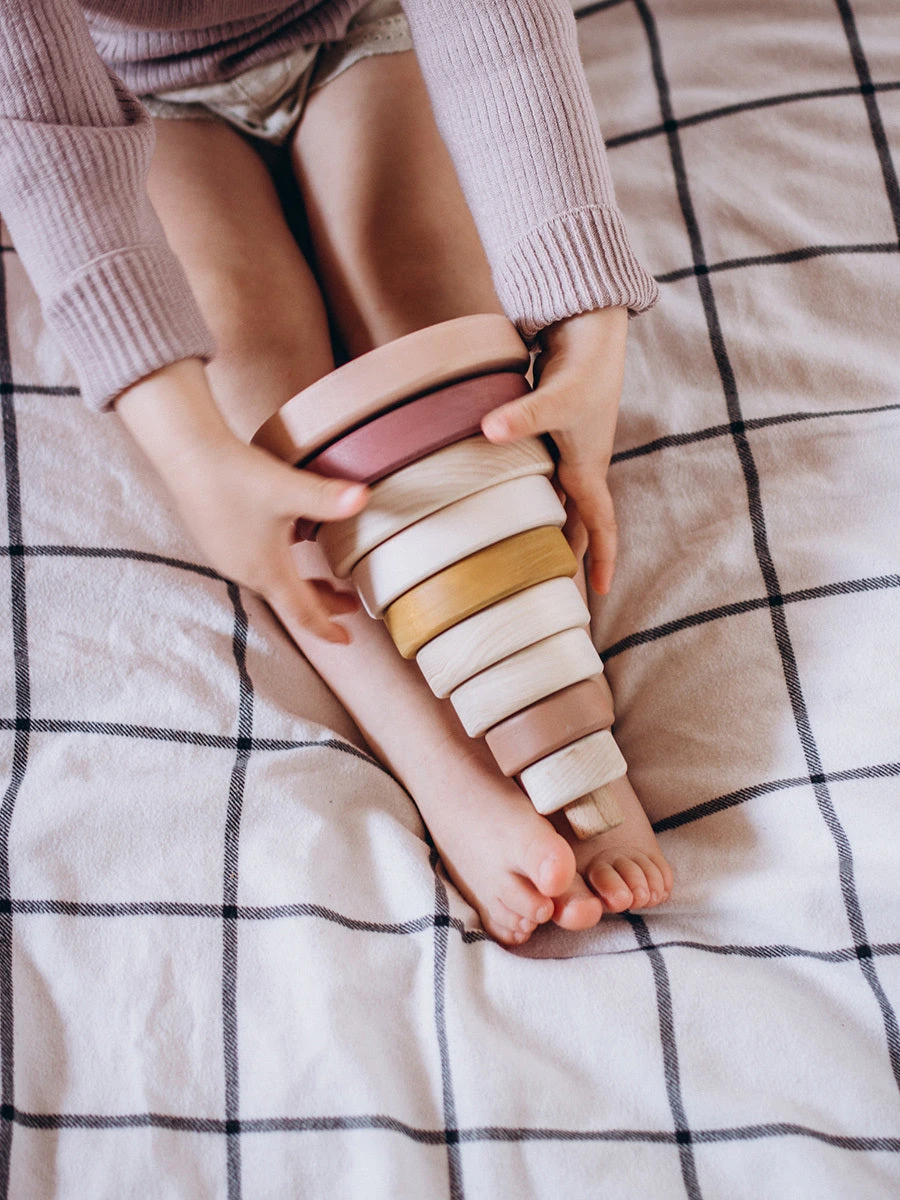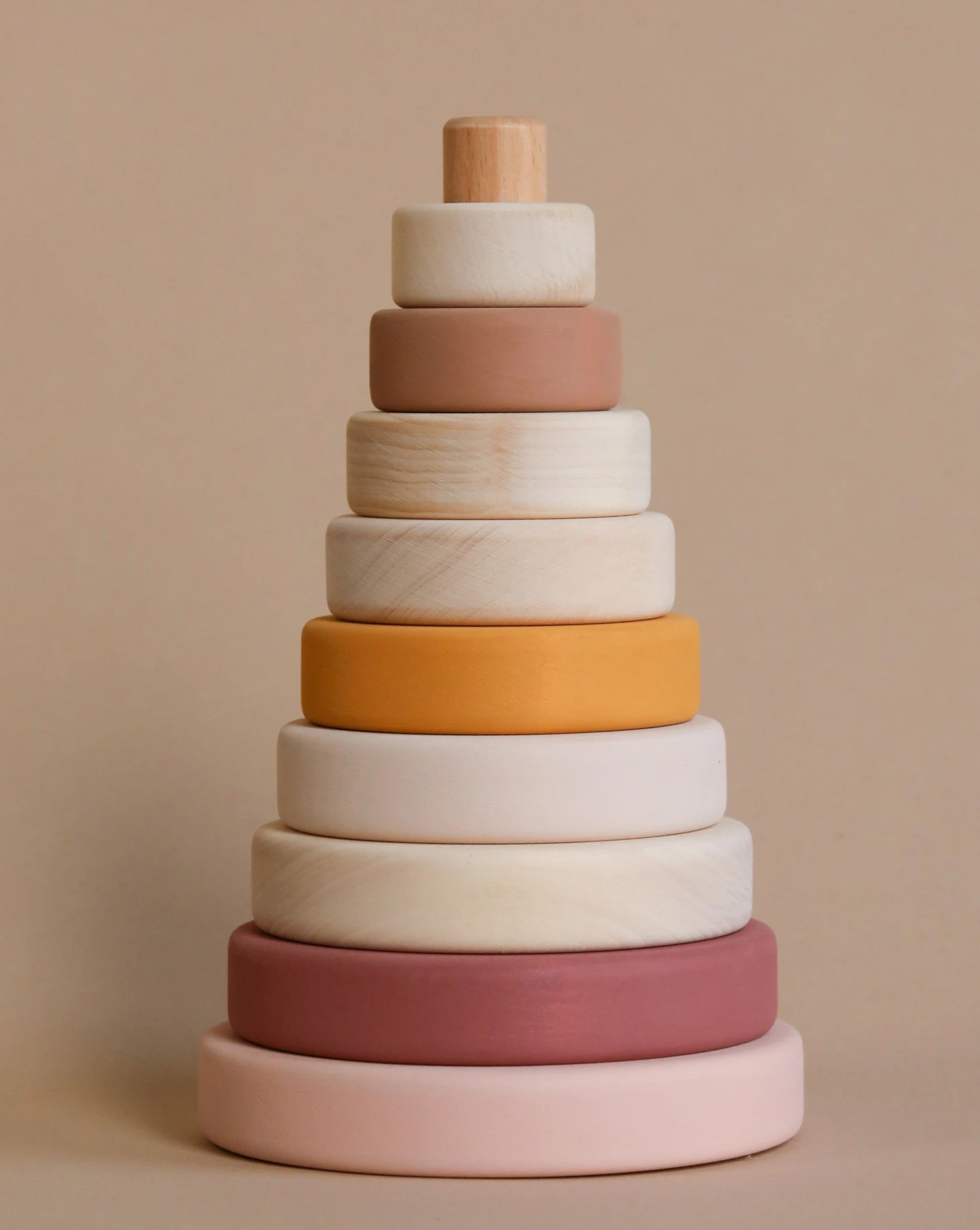 Handmade by Sabo Concept in Ukraine and painted with non-toxic, water-based paint. This stacking toy is great for hand-eye coordination.Â
